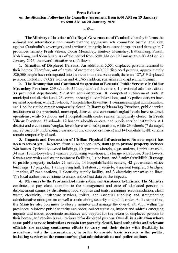 រាជធានីភ្នំពេញ៖«ក្រសួងមហាផ្ទៃ នៅព្រឹកថ្ងៃទី២០ ខែមករា ឆ្នាំ២០២៦នេះ បានឲ្យដឹងថា គិតចាប់ពីម៉ោង៦ព្រឹក ថ្ងៃទី៩ ខែមករា ដល់ម៉ោង៦ព្រឹក ថ្ងៃទី២០ ខែមករា ឆ្នាំ២០២៦នេះ មានពលរដ្ឋភៀសសឹក៥,៥៥១នាក់បន្ថែមទៀត បានបន្តវិលត្រឡប់ទៅលំនៅឋានវិញ ដូច្នេះក្នុងចំណោមពលរដ្ឋភៀសសឹកសរុបជាង៦សែន៤ម៉ឺននាក់ មានប្រមាណ៥សែន២ម