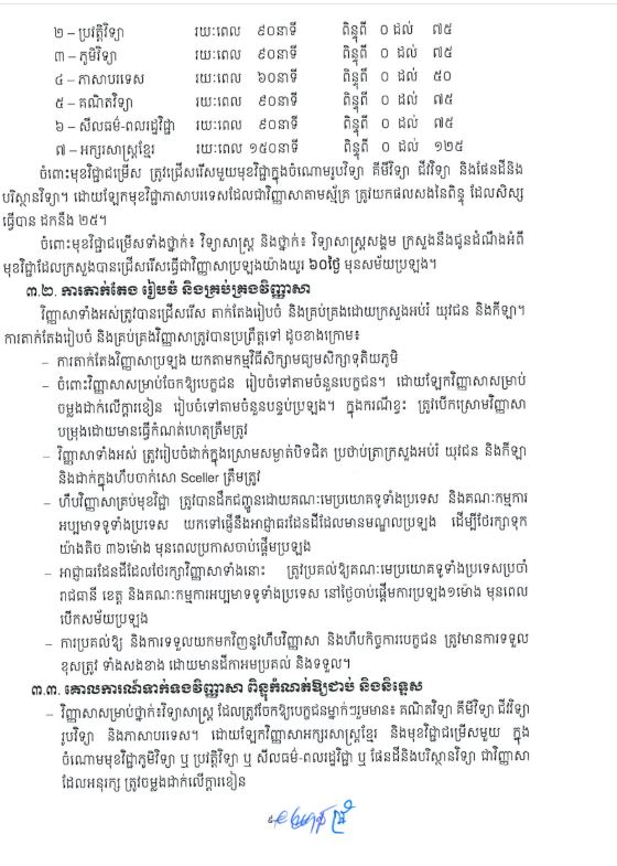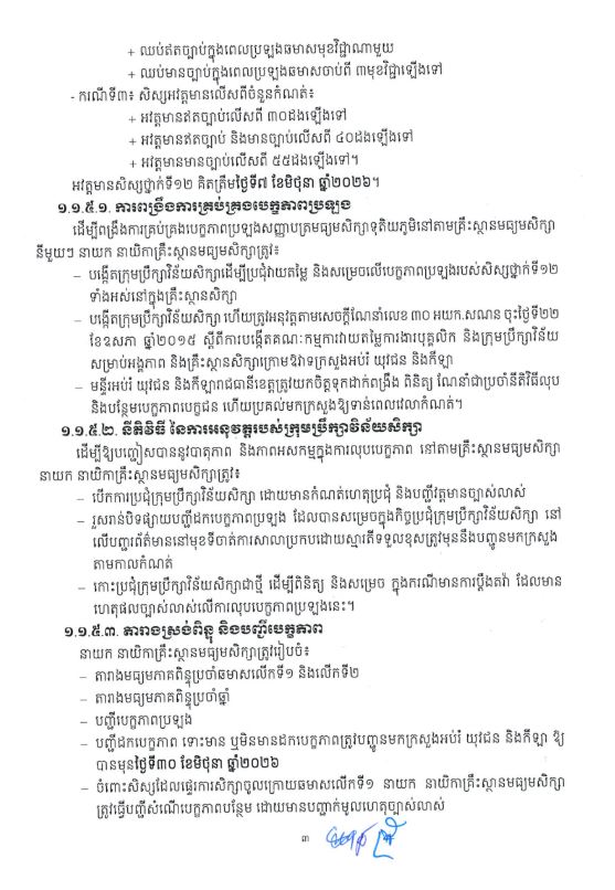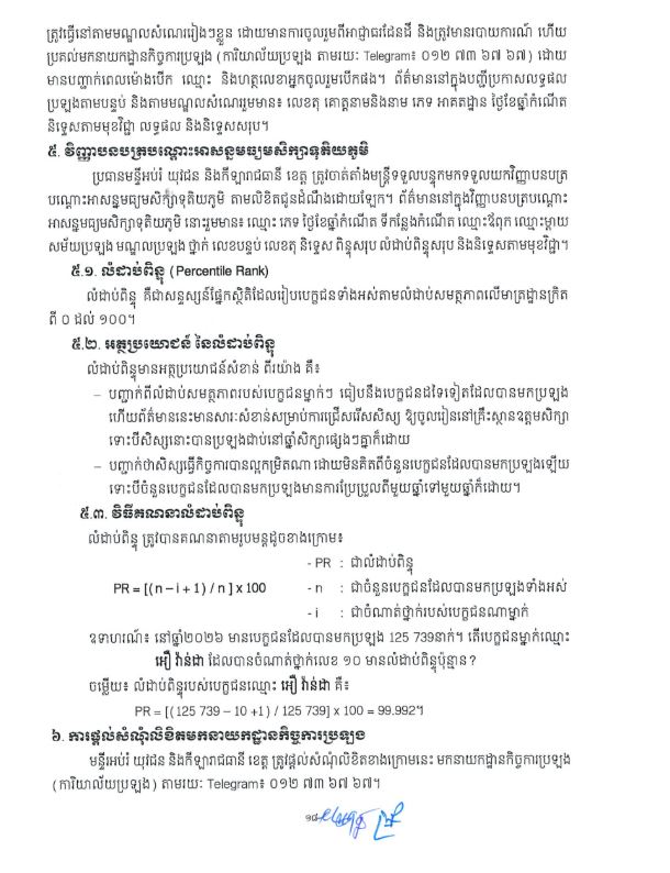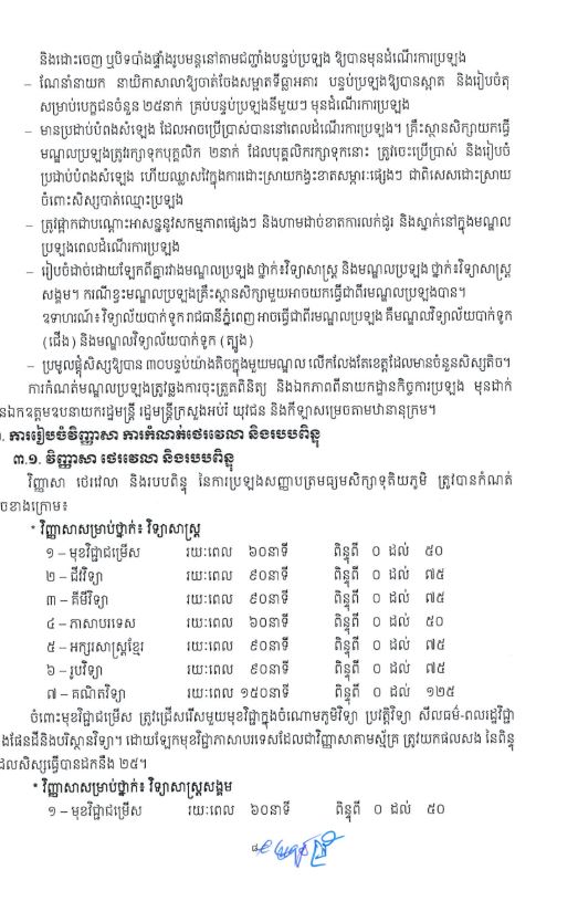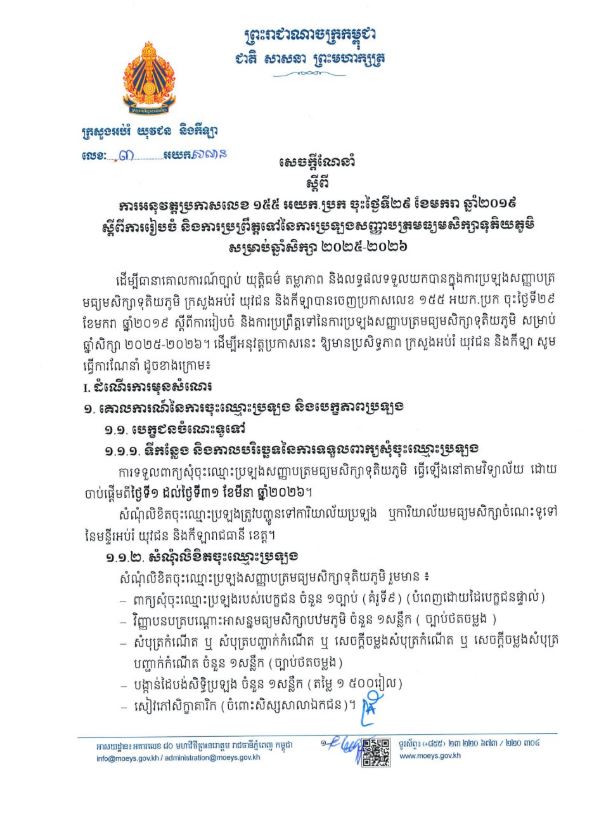 រាជធានីភ្នំពេញ៖ដើម្បីធានាគោលការណ៍ច្បាប់ យុត្តិធម៌ តម្លាភាព និងលទ្ធផលទទួលយកបានក្នុងការប្រឡងសញ្ញាបត្រ មធ្យមសិក្សាទុតិយភូមិ ក្រសួងអប់រំ យុវជន និងកីឡា បានចេញសេចក្តីណែនាំស្តីពីការអនុវត្តប្រកាសលេខ ១៥៥ អយក.ប្រក ចុះថ្ងៃទី២៩ ខែមករា ឆ្នាំ២០១៩ ស្តីពីការរៀបចំ និងការប្រព្រឹត្តទៅនៃការប្រឡងសញ្ញាបត្រមធ្យមសិក្សាទុតិយភូមិ សម្រាប់ ឆ្នាំសិក្សា ២០២៥-២០២៦៕