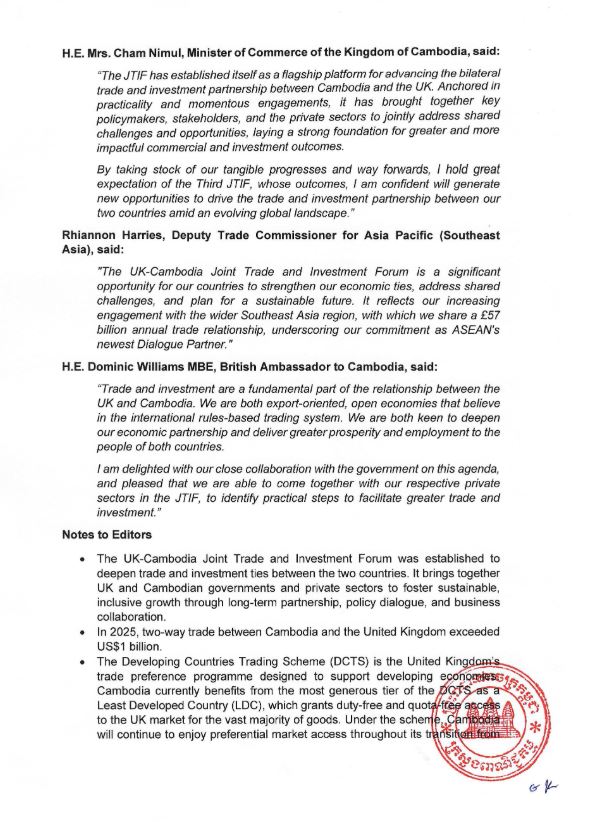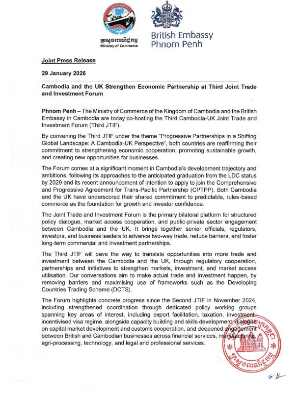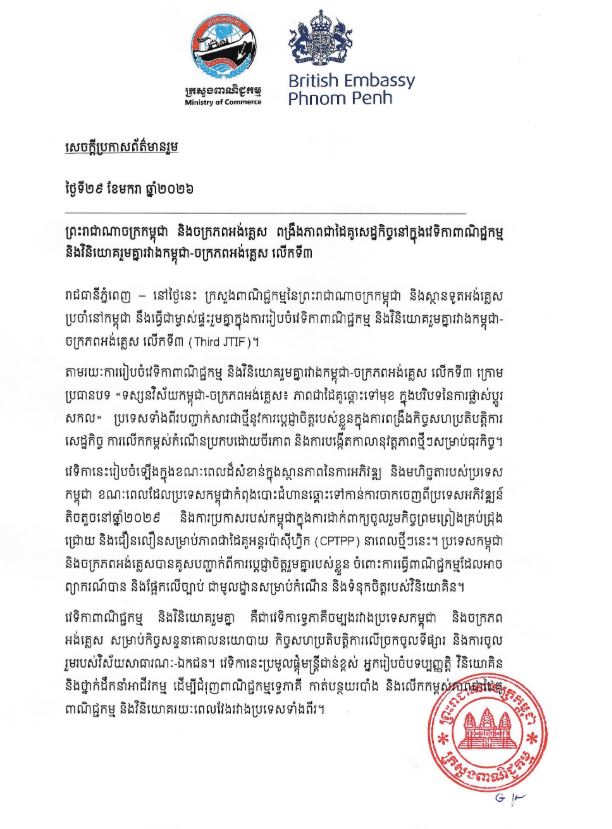 ក្រសួងពាណិជ្ជកម្មកម្ពុជា និងស្ថានទូតអង់គ្លេសប្រចាំនៅកម្ពុជា នៅថ្ងៃទី២៩ ខែមករា ឆ្នាំ២០២៦នេះ បានធ្វើជាម្ចាស់ផ្ទះរួមគ្នា ក្នុងការរៀបចំវេទិកាពាណិជ្ជកម្ម និងវិនិយោគរួមគ្នារវាងកម្ពុជា-ចក្រភពអង់គ្លេស លើកទី៣ (Third JTIF)។