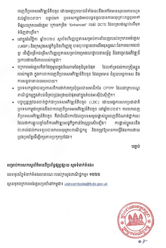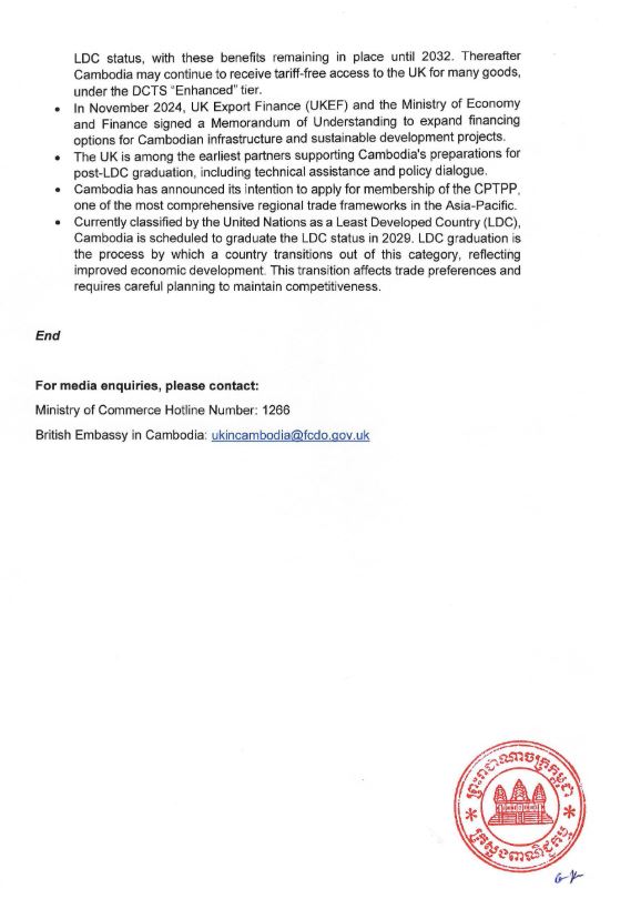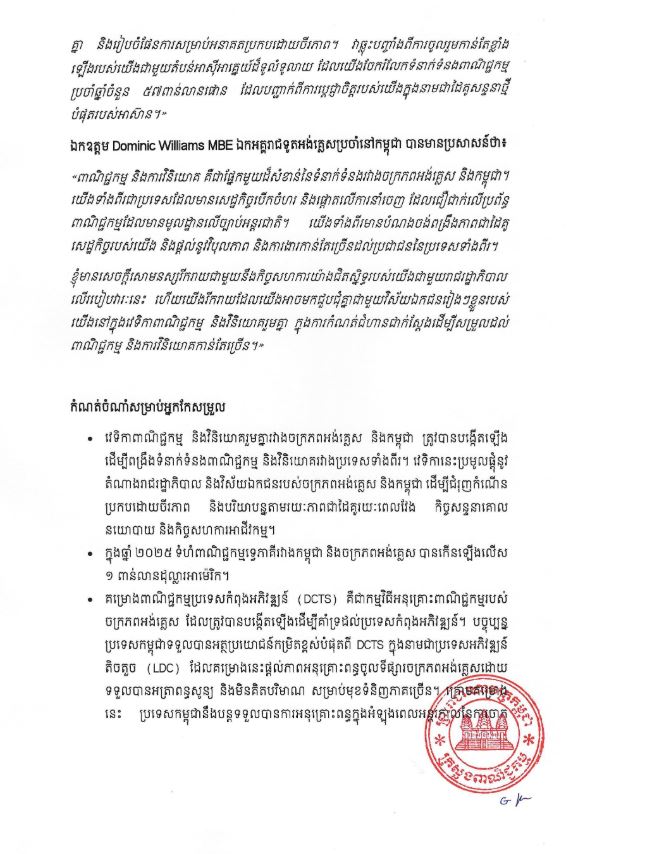 ប្រទេសកម្ពុជា និងចក្រភពអង់គ្លេសបានគូសបញ្ជាក់ពីការប្តេជ្ញាចិត្តរួមគ្នារបស់ខ្លួន ចំពោះការធ្វើពាណិជ្ជកម្មដែលអាច ព្យាករណ៍បាន និងផ្អែកលើច្បាប់ ជាមូលដ្ឋានសម្រាប់កំណើន និងទំនុកចិត្តរបស់វិនិយោគិន។