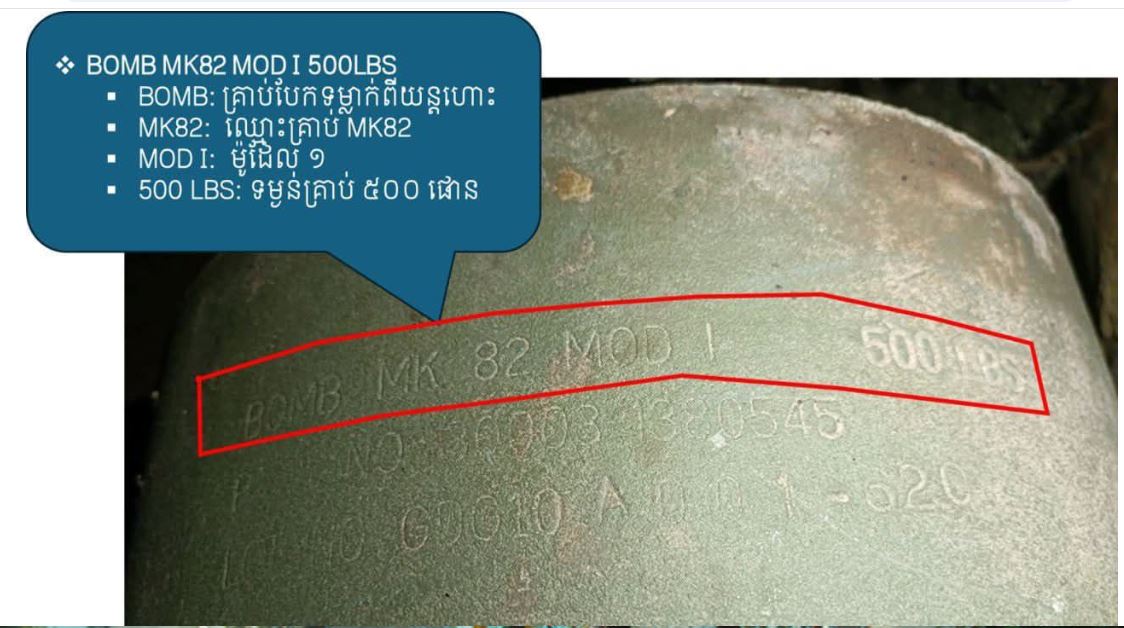 | CMAC ដោះគ្រាប់បែកប្រភេទ MK-82 ទម្ងន់ជាង ២៣០គីឡូក្រាមចំនួន ២គ្រាប់ ដែលទាហានថៃទម្លាក់ ក្នុងសង្គ្រាមឈ្លានពានលើកម្ពុជា |