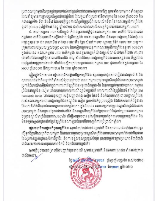 ឆ្លៀតក្នុងឱកាសនេះ រដ្ឋលេខាធិការដ្ឋានកិច្ចការព្រំដែន សូមបញ្ជាក់ជូនសាជាថ្មីដល់ជនរួមជាតិ និងសាធារណជនជាតិ-អន្តរជាតិទាំងអស់ឱ្យបានជ្រាបថា គណៈកម្មការចម្រុះខណ្ឌសីមាព្រំដែនគោក (JBC) កម្ពុជា ប្រកាន់ជំហរយ៉ាងម៉ឺងម៉ាត់ក្នុងការការពារខ្សែព្រំដែនអន្តរជាតិកម្ពុជា-ថៃ ដែលបន្សល់ទុកដោយគណៈកម្មការព្រំដែនឥណ្ឌូចិន-សៀម ដោយគោរពគោលការណ៍ច្បាប់អន្តរជាតិ គោលការណ៍ខ្សែព្រំដែនមិនកែប្រែ (Uti Possidetis Juris) គោរពអនុសញ្ញា សន្ធិសញ្ញាបារាំង-សៀម ផែនទី និងកំណត់ហេតុបោះបង្គោលព្រំដែនរបស់គណៈកម្មការបោះបង្គោលព្រំដែនឥណ្ឌូចិន-សៀម ព្រមទាំងកិច្ចព្រមព្រៀង និងឯកសារពាក់ព័ន្ធនានា ដែលភាគីទាំងពីរបានឯកភាពគ្នានាពេលកន្លងមក។ ក្នុងន័យនេះ គណៈកម្មការចម្រុះខណ្ឌសីមាព្រំដែនគោក (JBC) កម្ពុជា នឹងបន្តអនុវត្តការងារវាស់វែង និងខណ្ឌសីមាព្រំដែនឱ្យបានឆាប់បំផុតជាមួយគណៈកម្មការចម្រុះខណ្ឌសីមាព្រំដែនគោក (JBC) ថៃ ដើម្បីសម្រេចបាននូវសន្តិភាពយូរអង្វែងតាមបណ្ដោយព្រំដែន និងមិនទទួលស្គាល់នូវការកែប្រែខ្សែព្រំដែនណាមួយដែលកើតចេញពីការប្រើប្រាស់កម្លាំង។
