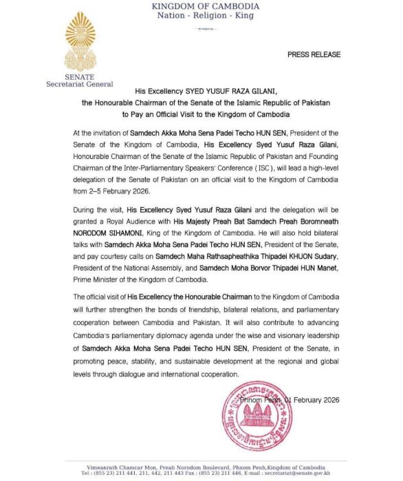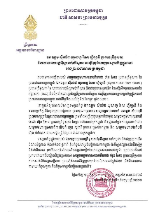 រាជធានីភ្នំពេញ៖តបតាមការអញ្ជើញរបស់ សម្តេចតេជោ ហ៊ុន សែន ប្រធានព្រឹទ្ធសភានៃកម្ពុជា លោក ស៊ីយ៉េដ យូសាហ្វ រ៉ាសា ហ្គីឡានី (Syed Yusuf Raza Gillani) ប្រធានព្រឹទ្ធសភា នៃសាធារណរដ្ឋអ៊ីស្លាមប៉ាគីស្ថាន និងជាប្រធានស្ថាបនិកនៃសន្និសីទប្រធានសភានៃអន្តរសភា (ISC) នឹងដឹកនាំគណៈប្រតិភូព្រឹទ្ធសភាប៉ាគីស្ថាន អញ្ជើញមកបំពេញទស្សនកិច្ចផ្លូវការនៅ ព្រះរាជាណាចក្រកម្ពុជា ចាប់ពីថ្ងៃទី២ ដល់ថ្ងៃទី៥ ខែកុម្ភៈ ឆ្នាំ២០២៦។