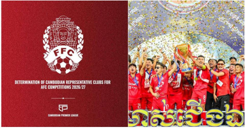 រាជធានីភ្នំពេញ៖សហព័ន្ធកីឡាបាល់ទាត់កម្ពុជា (FFC) បានធ្វើការកំណត់ក្លឹបបាល់ទាត់តំណាងជាតិចំនួន៤ ដែលមានសិទ្ធិចូលរួមការប្រកួតរៀបចំដោយសហព័ន្ធកីឡាបាល់ទាត់ទ្វីបអាស៊ី (AFC) ឆ្នាំ២០២៦/២៧។ នេះបើយោងតាមសេចក្ដីជូនដំណឹង ស្ដីពីគោលការណ៍កំណត់យកក្លឹបបាល់ទាត់តំណាងជាតិ ចូលរួមការប្រកួតអន្ដរជាតិ ដែលផ្សព្វផ្សា